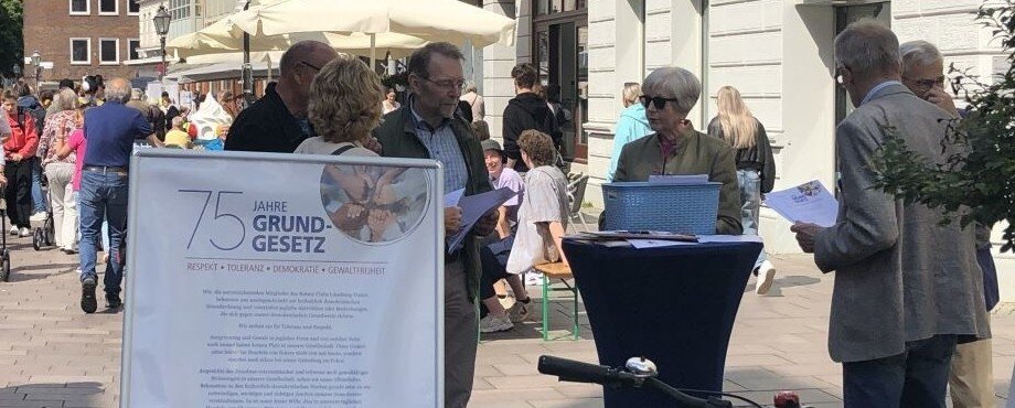 Anlässlich des 75-jährigen Bestehens des deutschen Grundgesetzes fand in der Lüneburger Innenstadt eine Demokratiemeile statt. Mitglieder des Rotary Clubs Lüneburg-Hanse nutzten dabei die Gelegenheit, mit Passanten ins Gespräch zu kommen. Grundlage war dabei ein Positionspapier, dass man als Reaktion auf das sogenannte "Remigrationstreffen" in Potsdam und auf Initiative einiger Clubfreunde erarbeitet hatte. Im Rahmen eines Workshops entstand ein gemeinschaftlich formulierter Text. Die Aussagen beträfen besonders die Menschenrechte, aber auch die vom Grundgesetz garantierten Grundrechte, so Präsident Joachim Loos.
