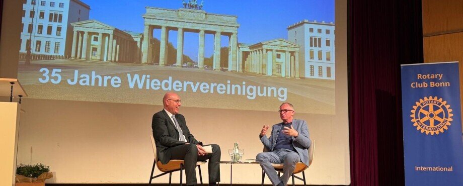 Die elf Clubs der Bonner Region, die seit über 50 Jahren in einem Koordinierungsausschuss miteinander verbunden sind, kommen alljährlich zu einer gemeinsamen Veranstaltung zusammen. In diesem Jahr hatte der RC Bonn die Federführung. Traditionsgemäß wird ein prominenter Redner eingeladen. Diesmal war es Matthias Gehler, Pressesprecher der letzten – und einzigen frei gewählten – DDR-Regierung. Er diskutierte im 35. Jahr der Wiedervereinigung mit dem Präsidenten des Hauses der Geschichte in Bonn, Harald Biermann, wie es um das Zusammenwachsen bestellt ist.