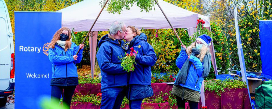 Der Rotary Club Hamburg-Hanse verkaufte in den vergangenen Adventswochen Mistelsträuße auf verschiedenen Märkten. Gemeinsam mit Nana Marie Werther und Francisca Wolf vom Rotaract Club Hamburg-Port demonstrierten die Initiatoren Kathrin und Gerd Bringewatt interessierten Kunden, was der eigentliche Zweck von über der Haustür aufgehängten Mistelsträußen ist: Wer sich darunter küsst, darf im neuen Jahr auf ganz viel Glück hoffen.