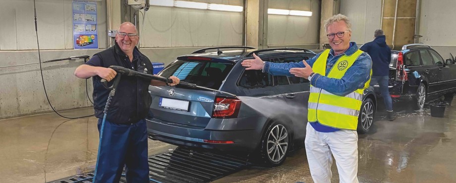 „Wir waschen Ihr Auto für einen guten Zweck“ hieß das Motto in der Einladung des Rotary Clubs Soest-Fachwerk, der seine jährliche Autowaschaktion am Rotary Action Day auf dem Gelände der Heinrich Hecker KG in Anröchte durchführte. Über diese originelle Idee für Fundraising freuten sich nicht nur die Autobesitzer und Clubmitglied Markus Köster (links), sondern auch Governor Thomas Meier-Vehring.