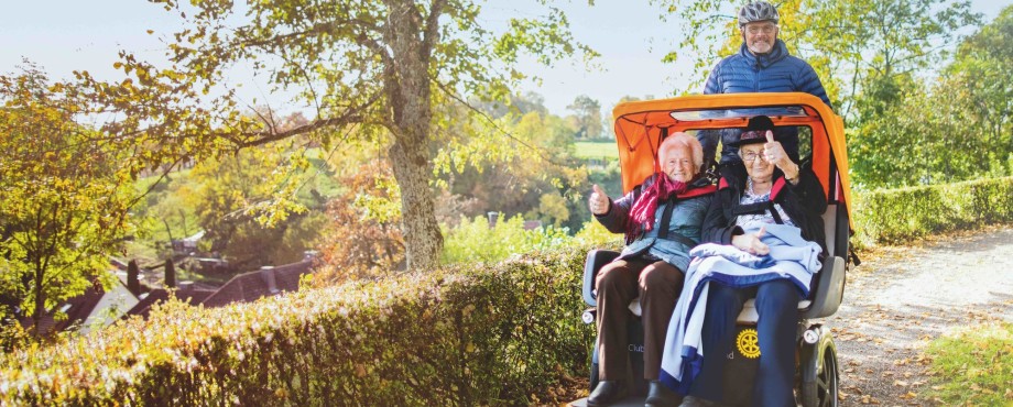 Während seines Präsidentenjahres 2021/22 hatte der passionierte Fahrradfahrer Helmut Kienzle (RC Bonndorf) die Idee für eine ebenso schöne wie – relativ – einfach umzusetzende Hands-on-Aktion zugunsten der Bewohnerinnen und Bewohner des Altenzentrums St. Laurentius. Zusammen mit seinem Club organisierte und finanzierte er eine Fahrrad-Rikscha, mit der sich jeweils zwei Bewohner gemütlich von ihm und anderen Fahrerinnen und Fahrern durch Bonndorf und Umgebung kutschieren lassen können.