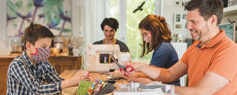 Gabriele Niederreiter (Mitte) hatte die Idee, überzeugte Ehemann Stefan (rechts) – und der seinen Rotary Club Dorfen. Gemeinsam rief man die Dorfener Bevölkerung zum Nähen sogenannter Community-Masken auf. In der Niederreiterschen Nähwerkstatt engagierten sich natürlich auch Tochter Sophie und Sohn Valentin. Clubfreund und Apotheker Jens Krautscheid übernahm eine der Verkaufsstellen – siehe „People of Action“-Anzeige auf der Umschlagseite hinten.