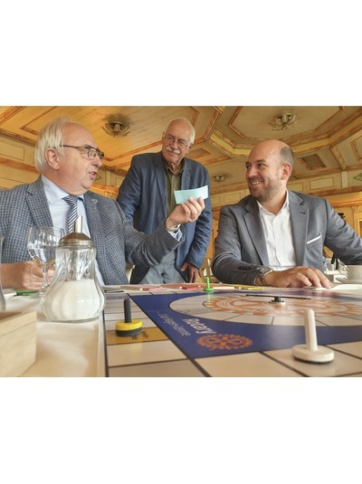 Auf allen Tischen steht je ein Spielexemplar aufgebaut bereit. Das Würfeln beginnt. Auf dem äußeren Ring gilt es Fragen zu den Themen Mitgliedschaft, Service-Projekte, rotarische Ethik, Struktur und Aufbau, Clubleben sowie Fragen zu Jugend und Internationalem zu beantworten. Für jede richtige Antwort wird die Spielfigur mit einem farbigen Ring belohnt. Wer sechs Symbolringe gesammelt hat, darf auf den inneren Ring wechseln. Die Fragen dort sind eher persönlicher Natur und dienen dazu, die Mitspieler am Tisch besser kennenzulernen. Sobald ein Spieler hier vier silberfarbene Ringe gesammelt hat, ist das Spiel beendet. Ziel erfüllt: Der Nachmittag an den Tischen ist kurzweilig und die Freunde haben gute Laune.