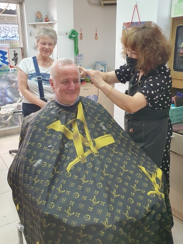 Wenig später begrüßt uns eine ältere Dame in einem kleinen Friseursalon. Sie kann kein Englisch, wir kein Mandarin. Doch es gelingt Elmar und Petra, sich mit Gesten so zu verständigen. Wenig später sitzt Elmar frisch gestylt vor uns. Eine kleine Rücken- und Nackenmassage gibt es sogar noch obendrauf. Dafür zahlt Elmar lediglich 150 Taiwan-Dollar, das sind umgerechnet 4,18 Euro.