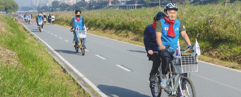 Wenn man vor Aufregung eh nicht gut schlafen kann, dann kann man auch früh aufstehen. So erging es Rotariern vom Club Cheongju Dream in Südkorea, die sich für eine ganz besondere Aktion im Mushimcheon River Park eingefunden hatten. Bereits seit fünf Jahren bietet der Club sehbehinderten Menschen eine vierstündige Tandemfahrt an. Für viele Bewohner des Gwanghwawon- Gruppenheims ist es eine seltene Gelegenheit, ihre Einrichtung einmal zu verlassen, da viele von ihnen eine individuelle Betreuung benötigen.