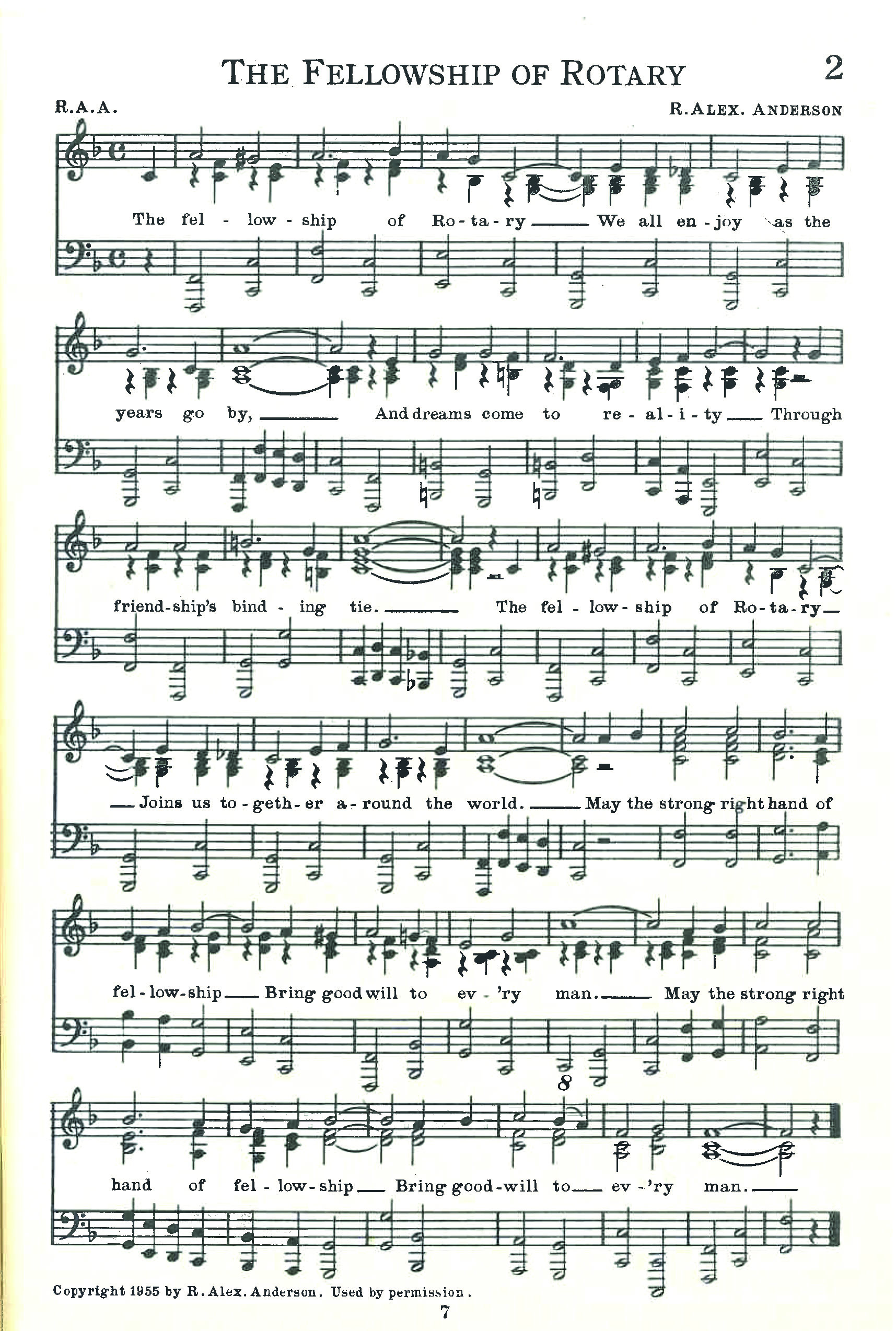 … heißt es in der Einleitung des RI-Liederbuchs Songs for the Rotary Club von 1956, dessen erste Ausgabe Rotary International 1925 herausbrachte. Das offizielle Songbook wurde immer wieder ergänzt, sodass es Mitte der 50er Jahre bereits drei Teile umfasste: Rotary-Lieder, patriotische Lieder über Freundschaft, Familie und Heimat sowie zahl-reiche Nationalhymnen. The Fellowship of Rotary (oben) schrieb der US-amerikanische Komponist Robert Alexander Anderson (1894–1995).