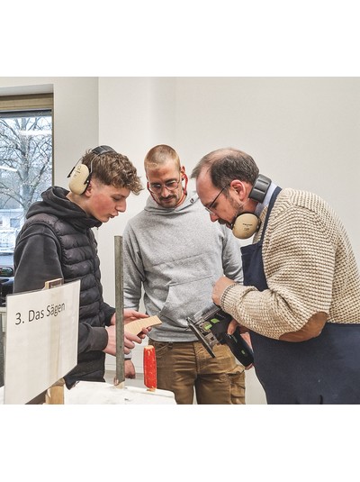 Handwerk pur: Die Schülerinnen und Schüler der Produktionsschule Göttingen lernen zuerst die Mitglieder des Rotary Clubs GöttingenSternwarte an, bevor diese selbst zu Schlagbohrer, Stichsäge und Schwingschleifgerät greifen dürfen. Das sind die etablierten Regeln, die seit 2015 das vertrauensvolle Miteinander bestimmen.
