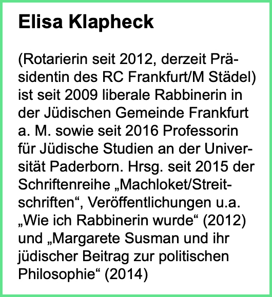 Die Referentin Elisa Klapheck (RC Frankfurt am Main - Städel) ist liberale Rabbinerin in der Jüdischen Gemeinde Frankfurt a. M. sowie Professorin für Jüdische Studien an der Universität Paderborn. Sie tritt ein für eine neue Wertschätzung der politischen Tradition des Judentums und damit für eine neue Verhältnisbestimmung zwischen Politik und Religion. An den Anfang ihres Vortrages stellt Elisa Klapheck einige grundlegenden Worte zu ihrer