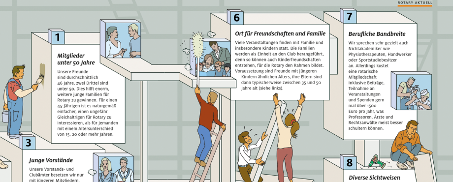Viele Veranstaltungen finden mit Familie und insbesondere Kindern statt. Die Familien werden als Einheit an den Club herangeführt, denn so können auch Kinderfreundschaften entstehen, für die Rotary den Rahmen bildet. Voraussetzung sind Freunde mit jüngeren Kindern ähnlichen Alters, ihre Eltern sind dann typischerweise zwischen 35 und 50 Jahre alt.