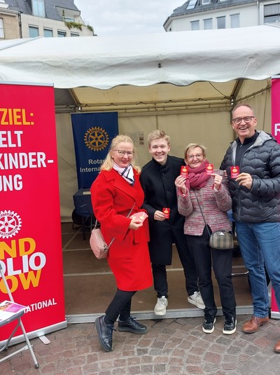 Auch in diesem Jahr war der RC Bonn International beim Bonner UN-Tag dabei. Im Mittelpunkt: die Kampagne End Polio Now, mit der Rotary sich weltweit seit 35 Jahren an der Ausrottung der Krankheit beteiligt. Die Rotarier des RC Bonn International und der rotarische Nachwuchs des Rotaract Clubs Bonn informierten auf dem Bonn Markt über die Aktion.