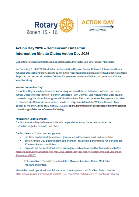Der Action Day hat sich in den letzten Jahren zu einem echten Highlight entwickelt. Er findet immer am Samstag vor Himmelfahrt statt – 2026 also am 9. Mai! Rotary, Rotaract, Interact, Inner Wheel und ihre Familien packen gemeinsam an und zeigen, was die rotarische Familie gemeinsam bewegen kann.