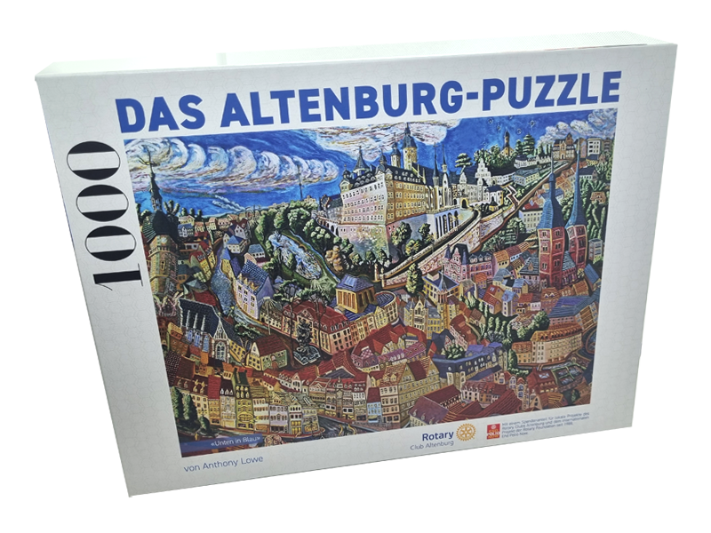 Der Rotary Club Altenburg aus dem Distrikt 1950 bringt ein 1000-teiliges Altenburg-Puzzle heraus, das nicht nur Puzzle-Spaß bietet, sondern gleichzeitig Gutes tut. Kreiert wurde das Motiv – eine Stadtansicht von Altenburg – von Künstler und Clubmitglied Anthony Lowe. Mit fünf Euro pro Puzzle unterstützen Käufer den Bau eines Volleyball-Feldes in Altenburg-Nord sowie End Polio Now.