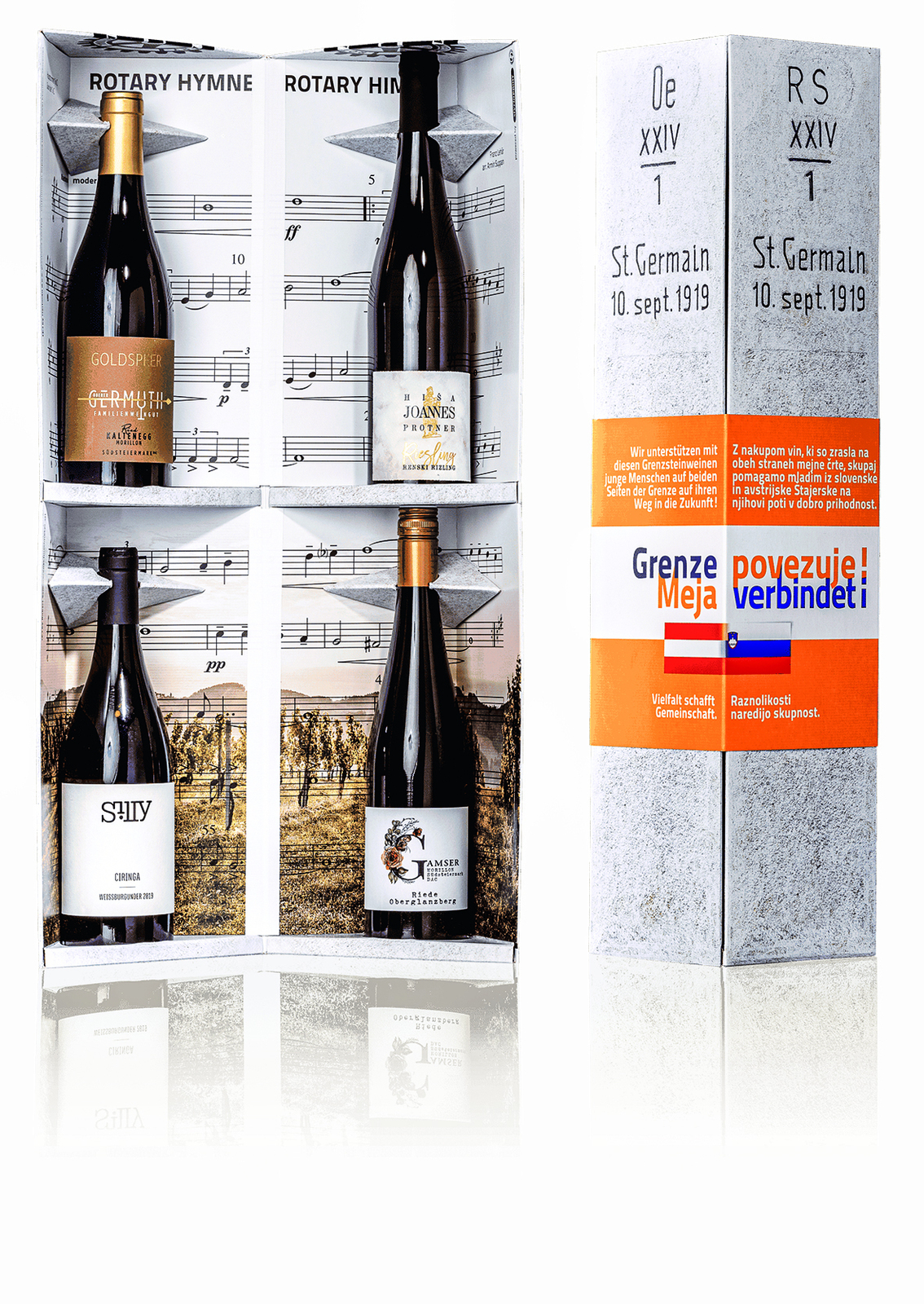 Der RC Steierska Stajermark (D1910) bietet die vier besten Riedenweine der rotarischen Weingüter Joannes (Slowenien), Gamser (Österreich), Oberer Germuth (Österreich) und Silly (Österreich) im rotarischen Weinkarton an. Mit dem Erlös unter-stützen die Clubmitglieder junge Menschen auf beiden Seiten der Grenze auf ihrem Weg in die Zukunft.