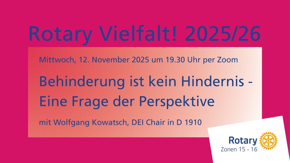 12. 11. 2025, 19.30 bis 20.30 Uhr: Meet#Up! – "Behinderung ist kein Hindernis – Eine Frage der Perspektive" mit Wolfgang Kowatsch, DEI-Chair in D1910 (Zoom-Link – HIER)